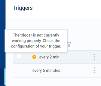 The trigger is active but currently unable to monitor event(s). (Shown with ! icon near the trigger name)