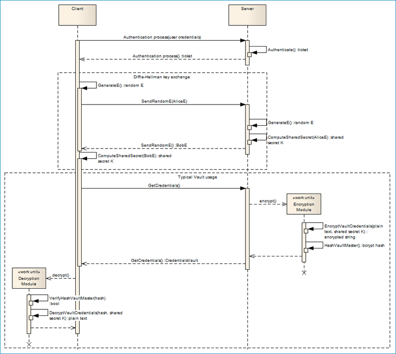 Upon each client request to access the Credentials Vault, the server computes a hash for the master password and encrypts it using the Diffie-Hellman algorithm.