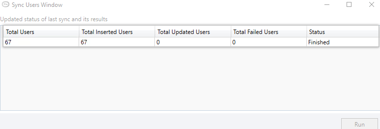 The Sync Users Window will close, and you will be returned to the Users tab. At any point, click the Sync Users button again to see the status of the sync process (but close the window without clicking the Run button again).