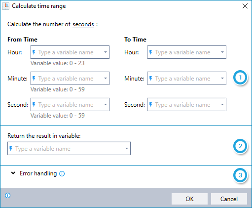 Each time parameter (hour, minutes, seconds) must be stored in its own variable. Therefore, when using this command, you are working with a total of 6 variables – 3 variables for each of the 2 times in the range.