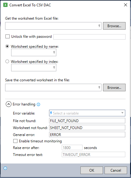 | Worksheet specified by name | The name of the worksheet you want to convert. It can be set manually or by using a variable. | Enter the worksheet name (e.g., Sheet1) or use a variable to define it. |