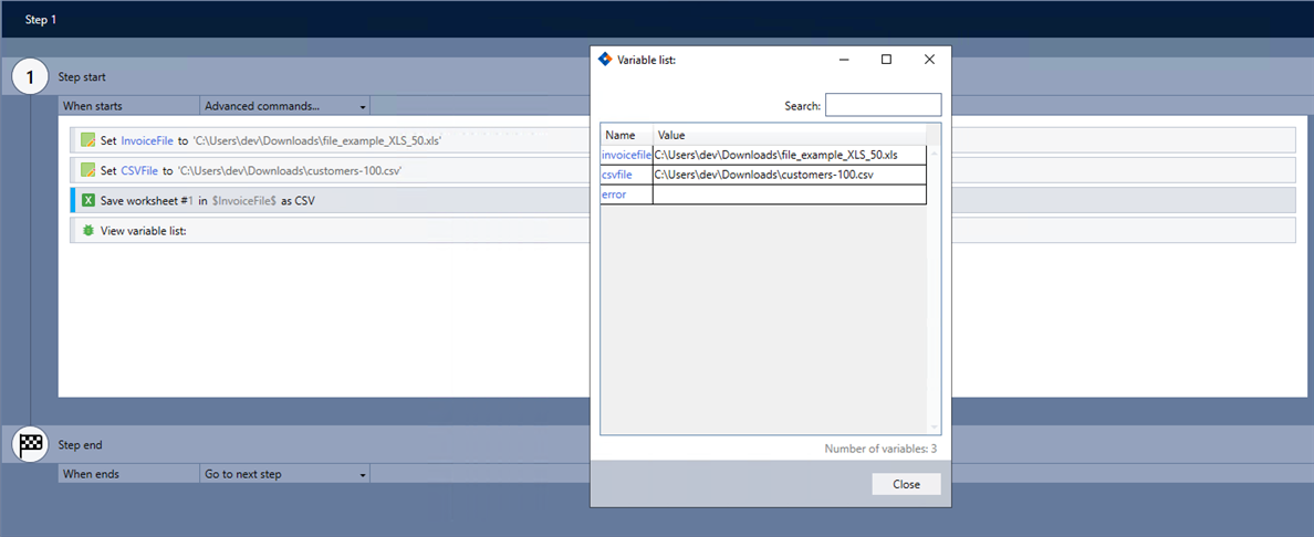 | Save the converted worksheet in the file | The full file path or variable for the converted CSV file. If the file does not exist, the wizard creates it. If the file exists, the wizard overwrites it. | Enter the full file path (e.g., C:\Users\dev\Downloads\customer_data.csv) for the CSV file, use a variable, or click Browse to choose a location. |
