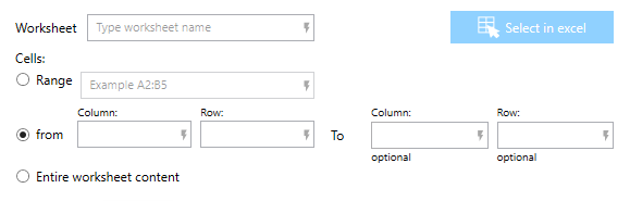 | Select in Excel | Optional feature to manually select the cells within Excel (requires Excel to be installed). | Click Select in Excel to select the cells you want to copy. | |