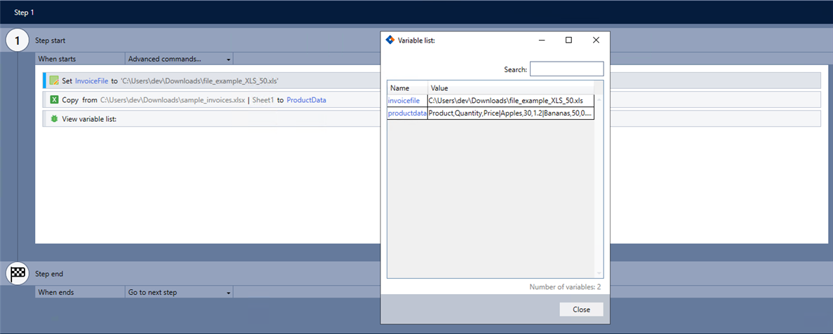 | Where to copy from | The Excel file containing the data you want to copy. You can reference it using a variable, enter the full file path, or browse for the file on your local machine. | Enter the full file path (e.g., C:\Users\dev\Downloads\sample_invoices.xlsx), use a variable, or click Browse to select the file from your computer. | |