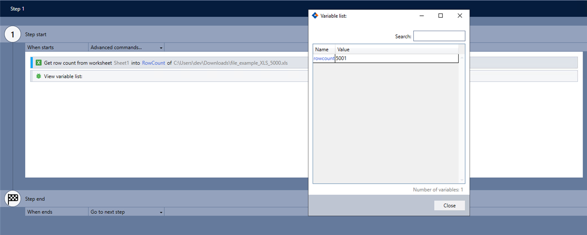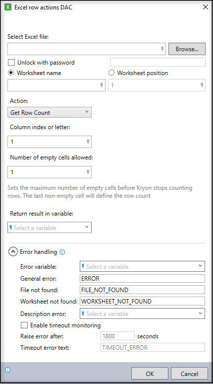 | Return result in variable | The variable to store the result. | Select a variable from the dropdown or enter a new variable name to store the result of the action. Use a descriptive name (e.g., RowCount). | |
