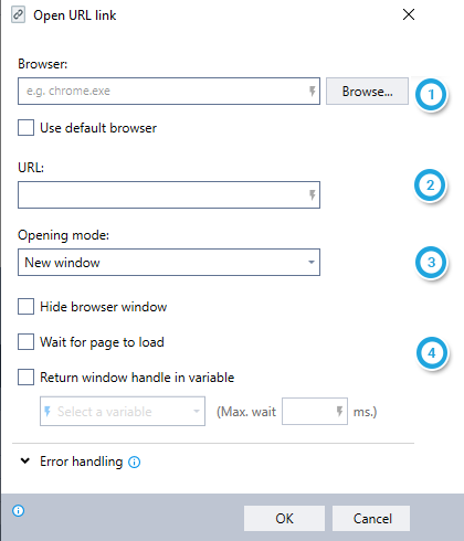 Opens a URL link using a selected browser in a selected location (current tab/new tab/new window).