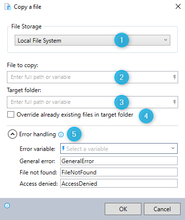 When adding a 'Copy a file' command, you have the option to select either the Local File System or SharePoint Online as the file storage location.