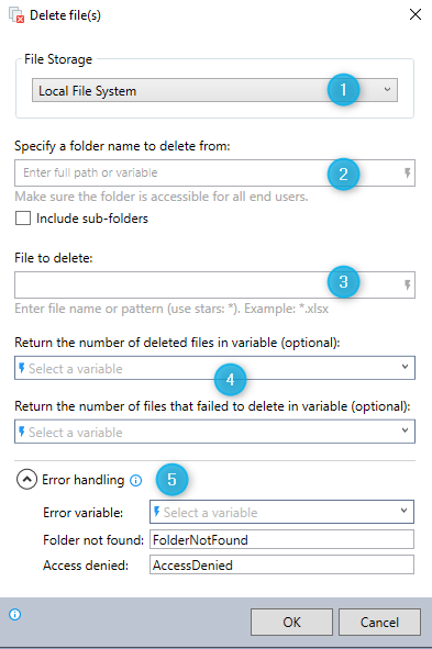 Delete one or more existing files from a specified folder, with the option to include sub-folders. Deleting more than one file requires that the files are named according to a pattern that can be represented using asterisks (*) as wildcards.