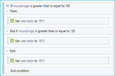 On each of the paths, use the Set Value command to store the correct rate table for the insured into a variable called