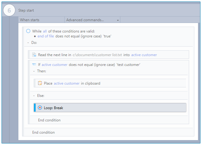 The Loop: Break command can be used only within the following "container"-type Advanced Commands that use a looping mechanism: