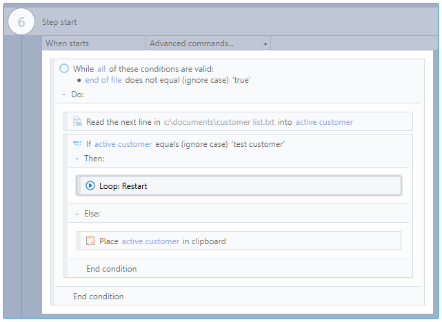 The Loop: restart command can be used only within the following "container"-type Advanced Commands that use a looping mechanism: