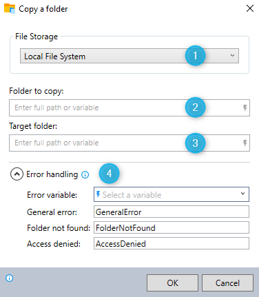 When adding a 'Copy a folder' command, you have the option to select either the Local File System or SharePoint Online as the file storage location.