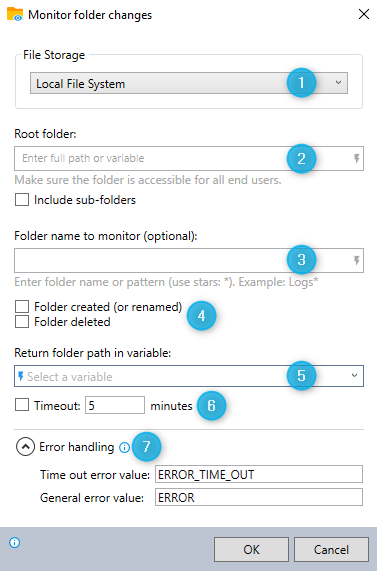 When adding a 'Monitor folder changes' command, you have the option to select either the Local File System or SharePoint Online as the file storage location.