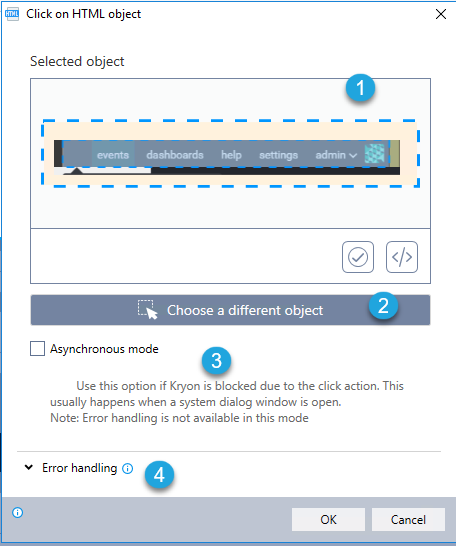 After selecting the object, the CLICK ON HTML OBJECT dialog will appear as follows: