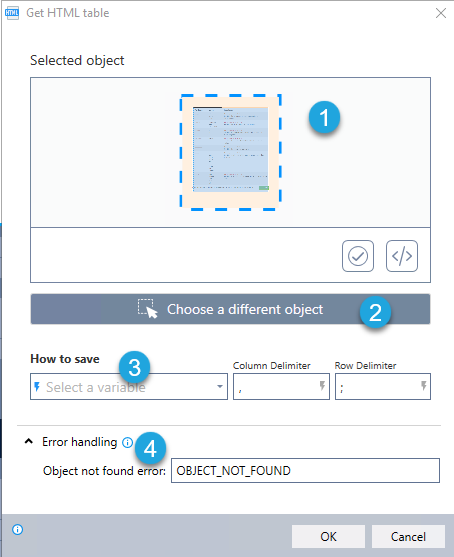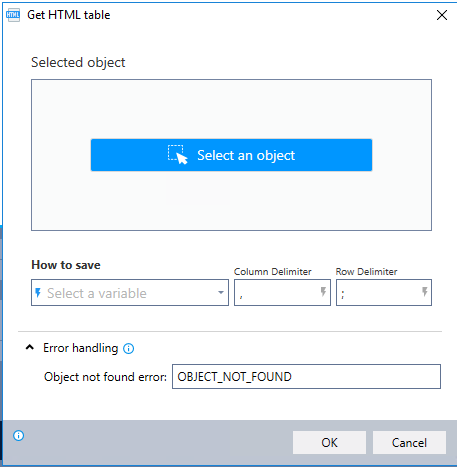 Retrieve the text of an HTML table in the currently active web page and place it into a new or existing variable. To enable easy parsing, searching, and formatting, the data returned by this command is separated into columns and rows using the delimiters you specify.