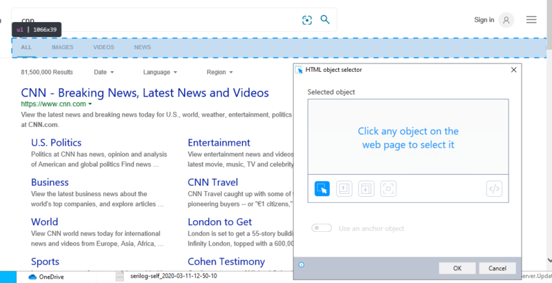 If the HTML object selector interferes with viewing or selecting the object you need, simply drag the dialog window to a more convenient location on the screen. -
