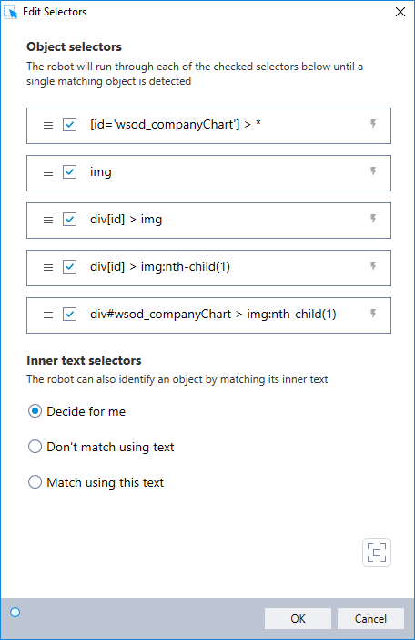 process. By default, the robot will run through these selectors in the order they appear until a single matching object is detected.