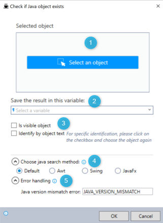 Verify the existence of an object within the currently active Java application and store the result of the check (TRUE/FALSE) in a variable.