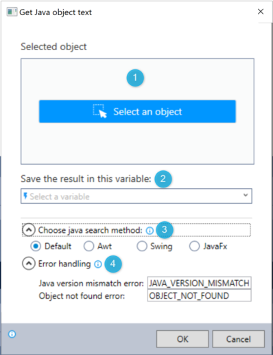 Retrieve the text of an object in the active Java application and place it into a new or existing variable.