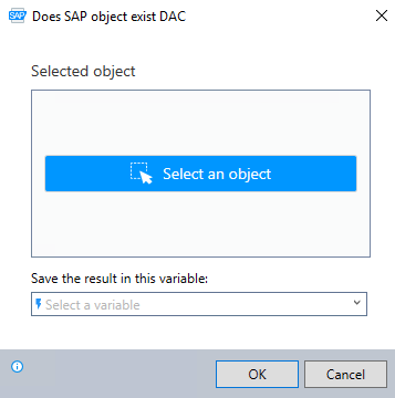 The Does SAP object exist dynamic advanced command is part of SAP commands, enabling various tasks with wizards in the SAP application. Use this command to check the existence of SAP GUI window elements, such as toolbars, menus, checkboxes, buttons, in the current user interface and store the result in a variable. To use this command in your automation workflow, drag it into a wizard by using the Advanced commands view in the Nintex Wizard Editor.