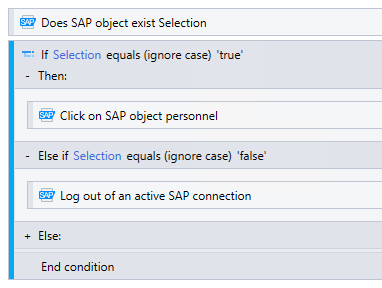 The Does SAP object exist command allows you to interact with various SAP GUI window elements by combining commands to verify an object's existence and conditionally execute actions based on real-time conditions. This example shows the command's usage with the If Else command.