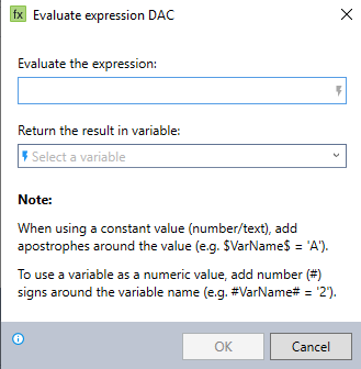 Add the Evaluate expression command to your wizard and complete the following fields: