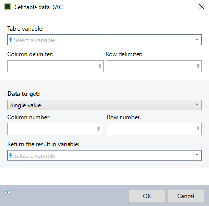 | Data to get | Data to get | The type of data to retrieve from the table | Select the type of data you want to retrieve (e.g., Single value, Entire row, etc.). |