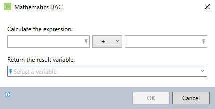 The Mathematics dynamic advanced command is part of the variable commands. Use this command to perform basic calculations (addition, subtraction, multiplication, division, or modulus) using constants and/or values copied from other variables. Drag it into a wizard from the Advanced commands view in the Nintex Wizard Editor to use it.