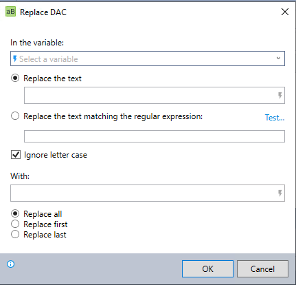 | In the variable | The variable that contains the text you want to change. | Type the variable name or select it from the list. |