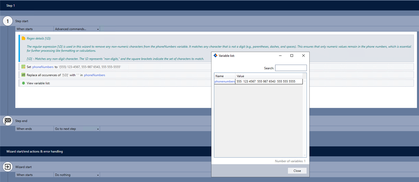 The Regular expression tester allows you to test how regular expressions (regex) behave in two ways: finding text and replacing text. This is a powerful tool to verify your regex patterns before applying them in your wizard.