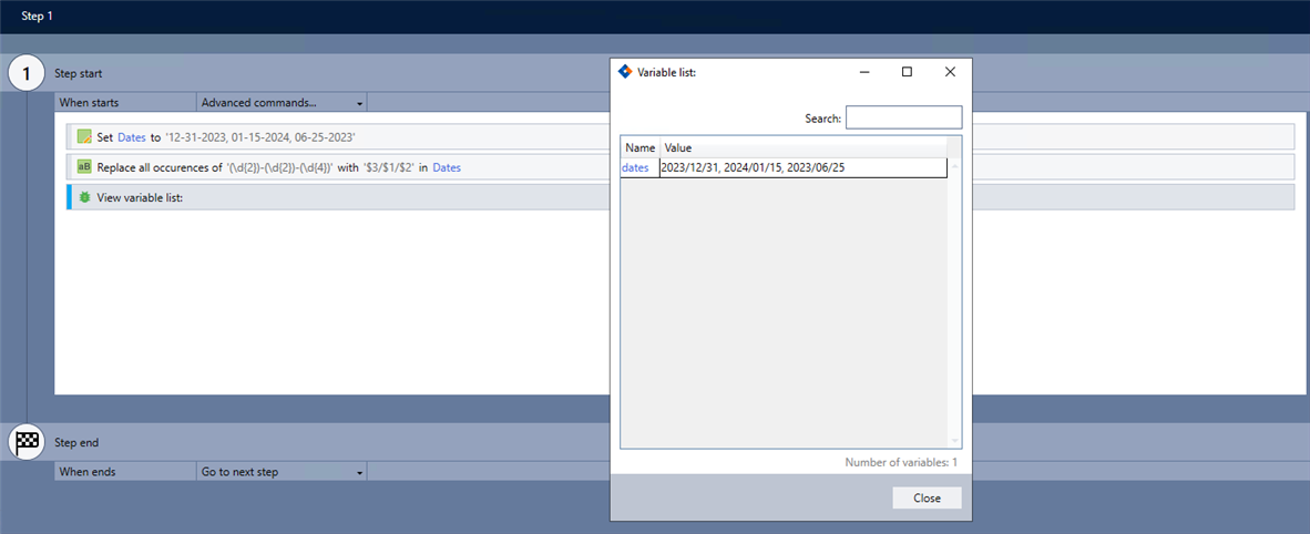 In the following example image, a regular expression is used in the With field to reformat dates. The command changes dates from MM-DD-YYYY to YYYY/MM/DD by capturing and rearranging the parts of the date. This highlights how regular expressions can be used for flexible, pattern-based replacements.