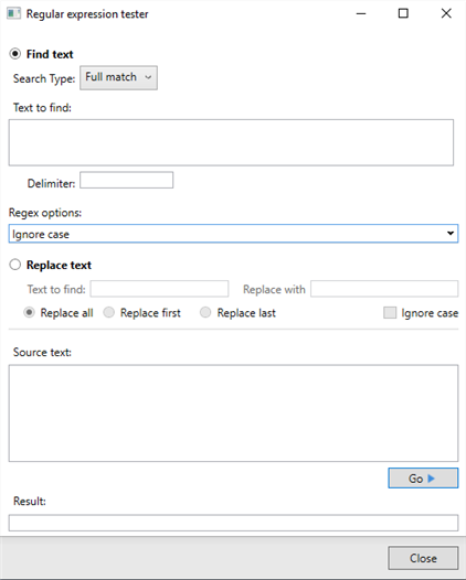 | Go > | Runs the search or replace operation using the defined regex pattern or text. Displays the search results or modified text in the Result field. | Click to run the regex-based search or the replacement operation, depending on your selection, and view the output in the Result field. | ||