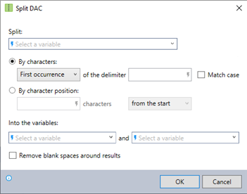 Option to remove any blank spaces at the beginning and end of the split variables (e.g., <Space>, <Tab>, and <Enter>). This option is unchecked by default. | Specify if you want to remove leading and trailing blank spaces from the split results. |