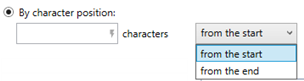 Select By character position and choose a single variable or enter a numeric value representing the number of characters from the start or from the end of your selected string. Use the Find command to first locate the position of a specific value. |