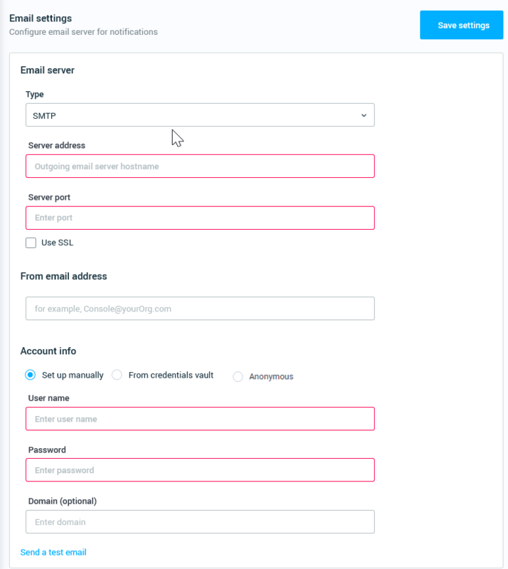 Set up the Account info - You can enter info manually, select credentials vaults, or select login anonymously (if using an SMTP server).