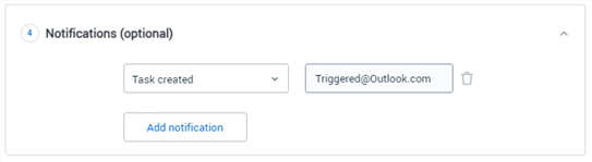 Set the Notifications (optional) if you want the system to send out email notifications when task-related events occur. Notifications are sent from the email configured in the Notification section on the Settings tab of the Console Plus. Make sure to specify the email addresses to which you'd like notifications to be sent. You can add as many notifications as needed.