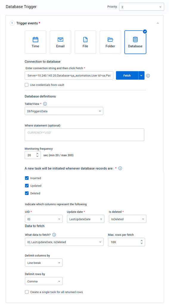 Select the events that the trigger should monitor for database records, defining the activities on the database side that will trigger a task, such as when a new table record is Inserted, Updated, or Deleted. These checkboxes are accessible only when connected to a database.