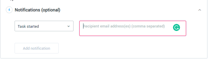 Set the Notifications (optional) if you want the system to send out notifications by email when task-related events occur. Notifications are sent from the email configured on the Notification Settings page. Make sure to specify the email address/es to which you'd like notifications to be sent from there.