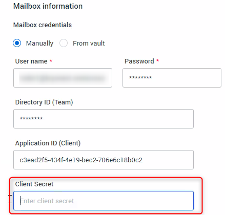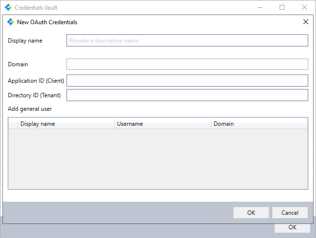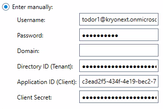Create your credentials by entering a Display name and the Domain, Application ID (Client), and Directory ID (Tenant) as given in Step 6 of Configuration.