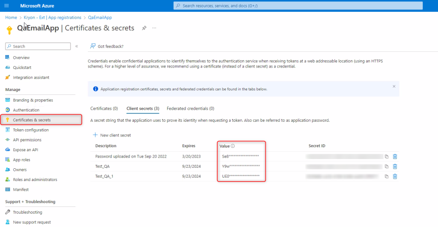 You only have access to the client secret Value when you create it. If you did not copy the value when creating the client secret, you need to create a new one by selecting New client secret.-
