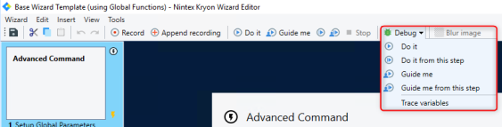 You can debug with Do it or Do it from this step, to check the steps of the wizard. Open the wizard from the Wizard Catalog in the Nintex Studio and select Debug: