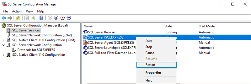 Go to SQL Server Services, right-click SQL Server [SQL edition] > Restart.