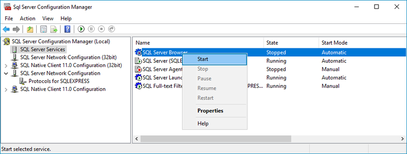 Right-click the SQL Server Browser service and select Start