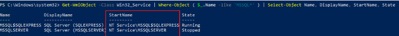 Get-WmiObject -Class Win32_Service | Where-Object { $_.Name -like 'MSSQL*' } | Select-Object Name, DisplayName, StartName, State