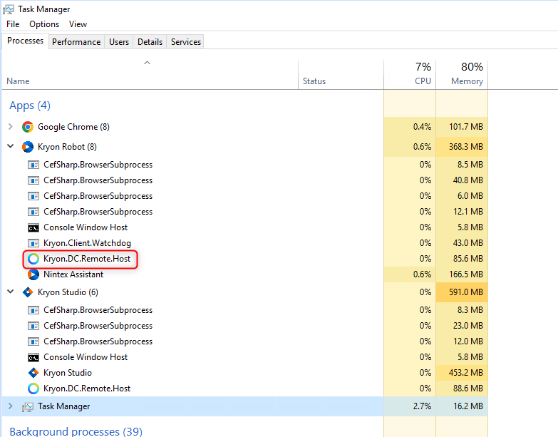 To confirm that the service is running, open Task Manager and look for Kryon.DC.Remote.Host service: