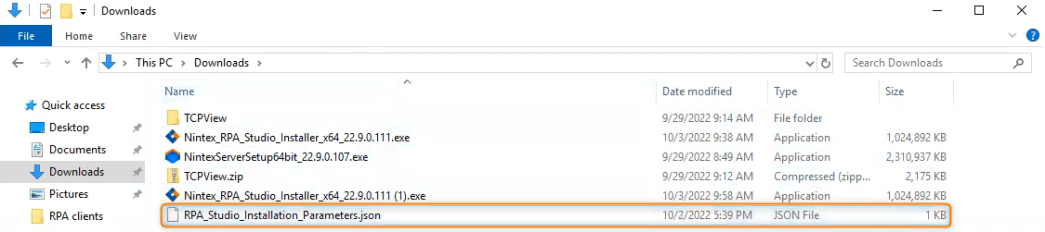 After the server installation is complete, move the JSON Source Files to the same location as the RPA client installer files (MSI or EXE files) and edit the JSON file parameters as needed.