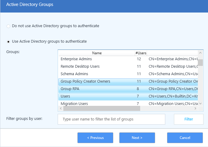 • Select Filter to filter Active Directory Groups by user.