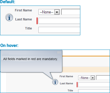 A tooltip is robot-controlled bubble (icon) that informs the end-user of additional information or validation errors. The tooltip appears as an icon on the screen, attached to an anchored bubble that appears when the user hovers over the icon with the mouse cursor.