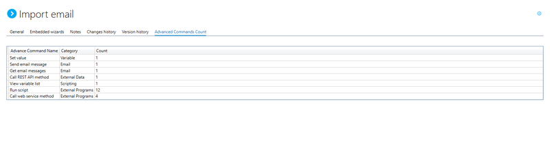 The ADVANCED COMMANDS COUNT tab provides a list of the Advanced Commands found in wizards and sensors.