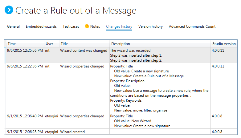 The Change History tab contains a table listing all changes made to the selected wizard’s content and properties since it was created: